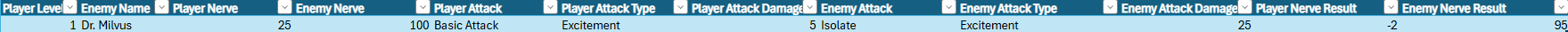 I used the above calculator to finalize the mechanics for the finale of our vertical slice, the boss fight against Dr. Milvus. Throughout the fight, he will attempt to lower your defence and then hit you with a strong move. To encourage the player to strengthen themselves throughout the playtest, you won’t be able to survive the attack at level 1. With each subsequent level, you get a bigger threshold to survive the attacks, meaning you won’t always have to be at full health. The attack is called “isolate”, representing the therapist singling you out with a hard-hitting question, one that would devastate the player in the moment, but after making it through the encounter, will make them stronger for it (by levelling up from the boss).