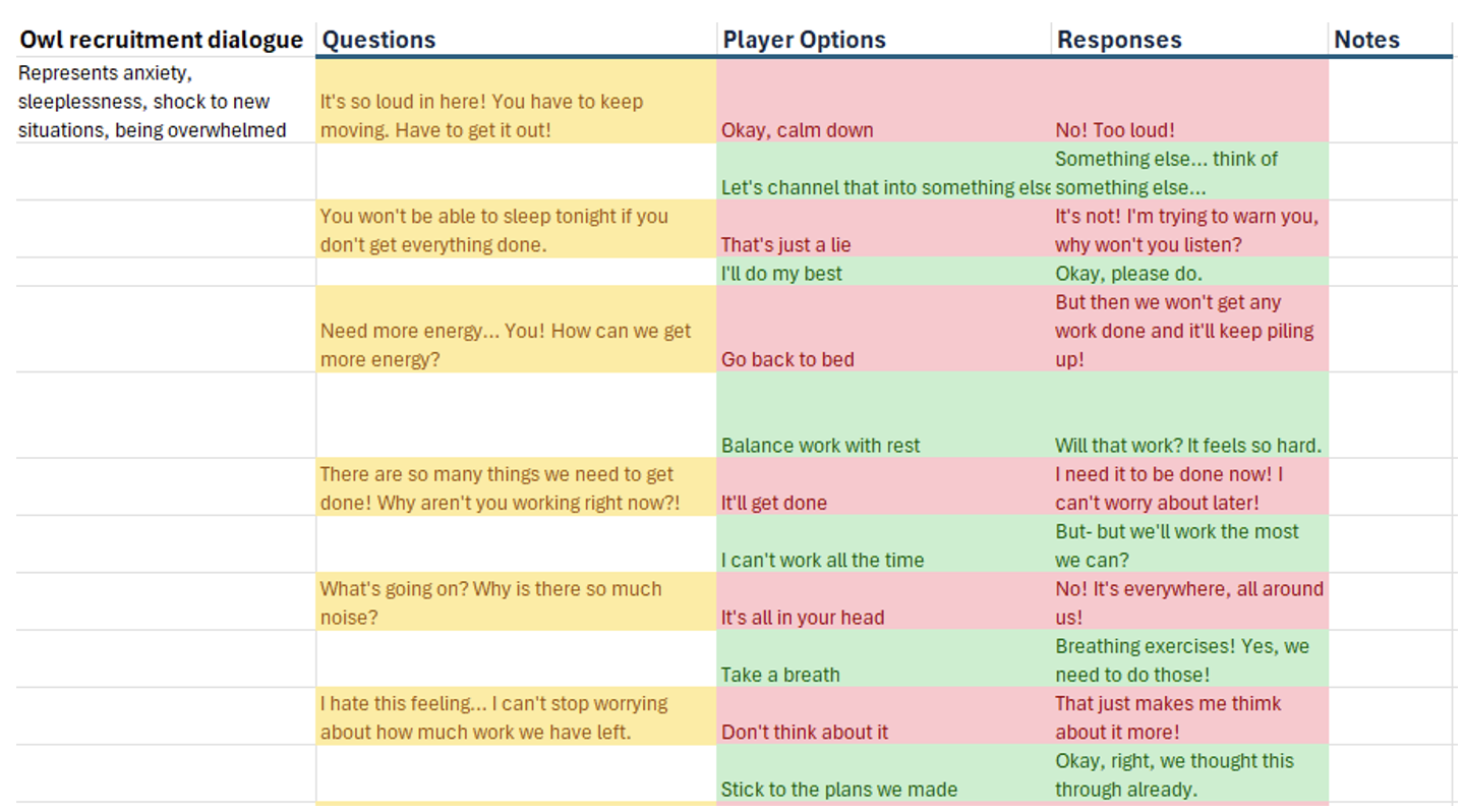 Thankfully, I had an early start to writing NPC dialogue. The ideas presented in our earlier playtesting sessions successfully conveyed the game’s themes and character goals, so I had a good direction for refining the dialogue. The recruitment dialogue was much harder.